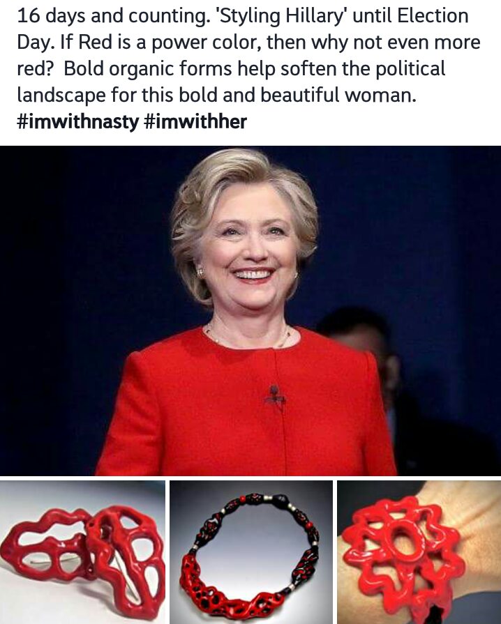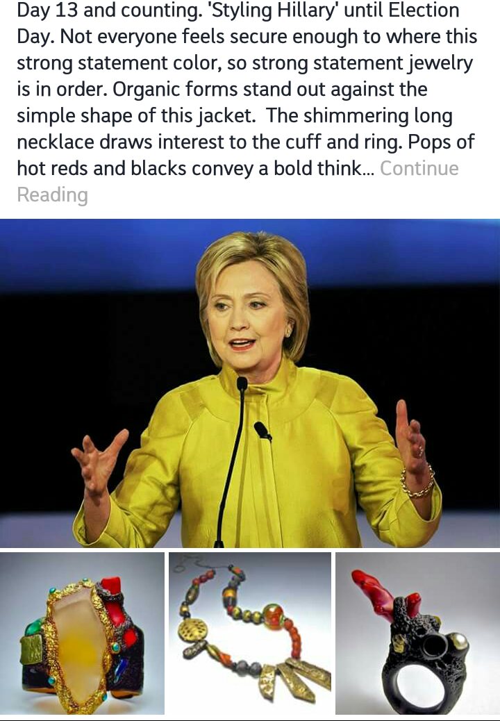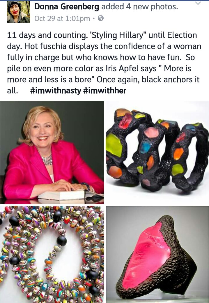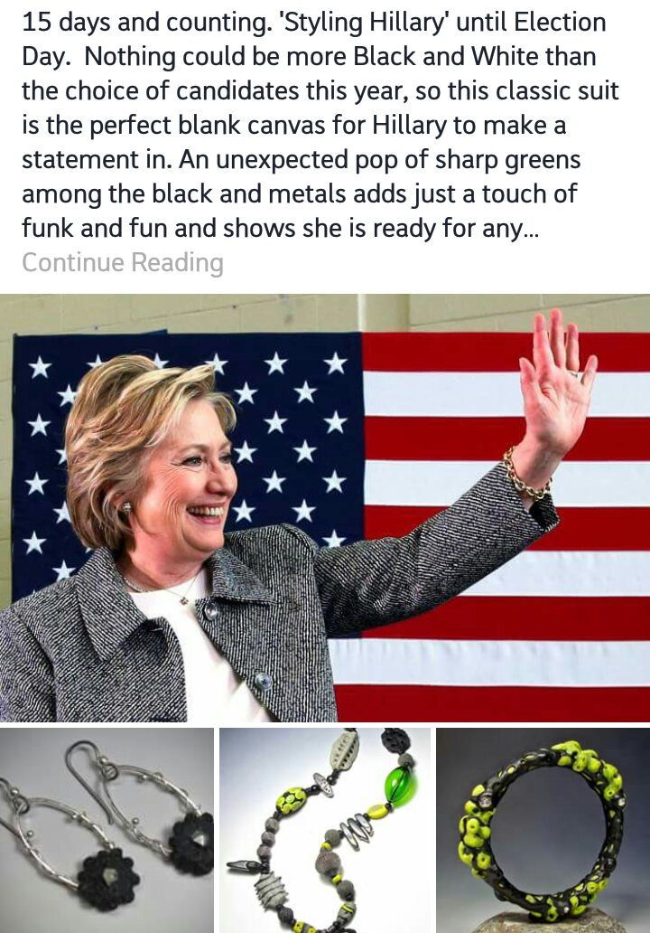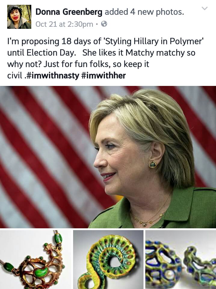 So all this days I spend at home Donna Greenberg‘s “Styling of Hillary in Polymer” has been the highlight of my days. She came up with the idea of styling her favorite candidate with her own creations. Hillary is known for her monochrome power suits and a little oomph is just what she needs!