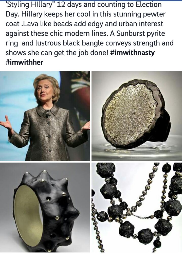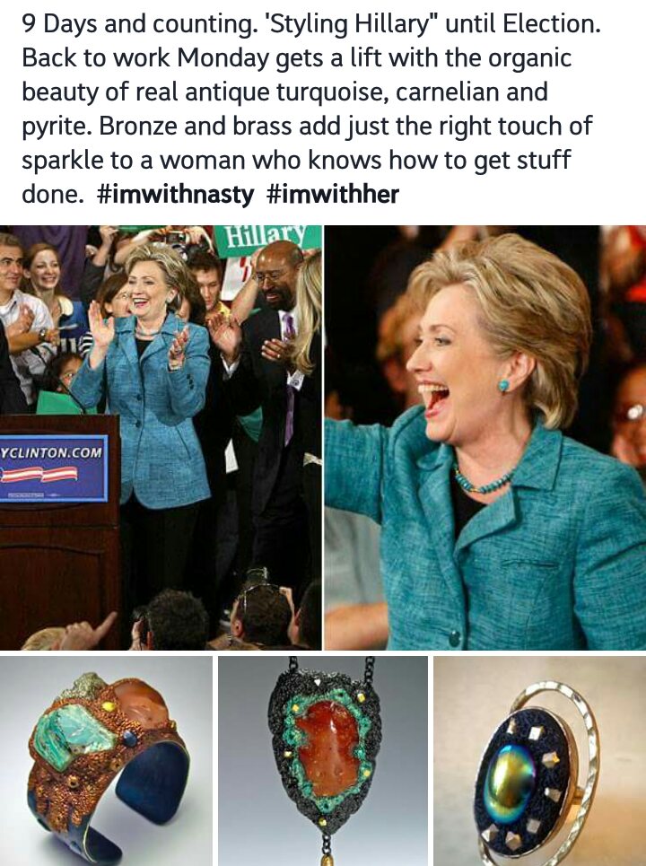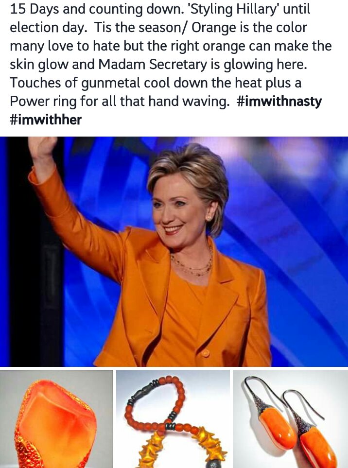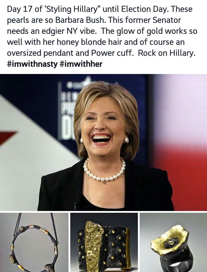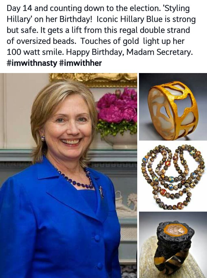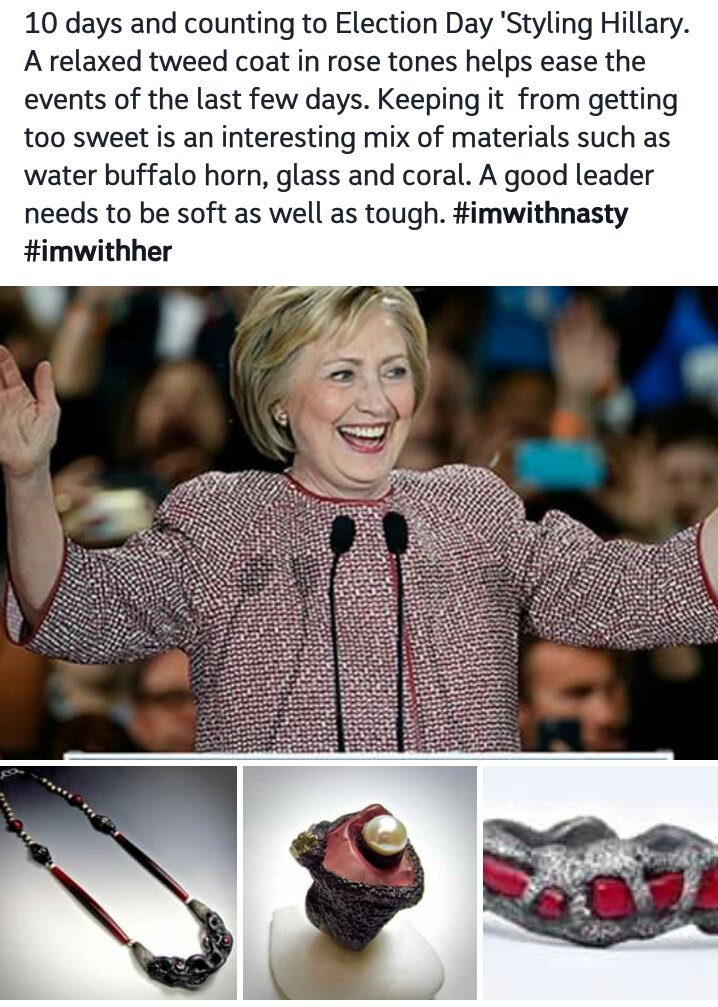 So all this days I spend at home Donna Greenberg‘s “Styling of Hillary in Polymer” has been the highlight of my days. She came up with the idea of styling her favorite candidate with her own creations. Hillary is known for her monochrome power suits and a little oomph is just what she needs!